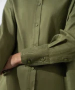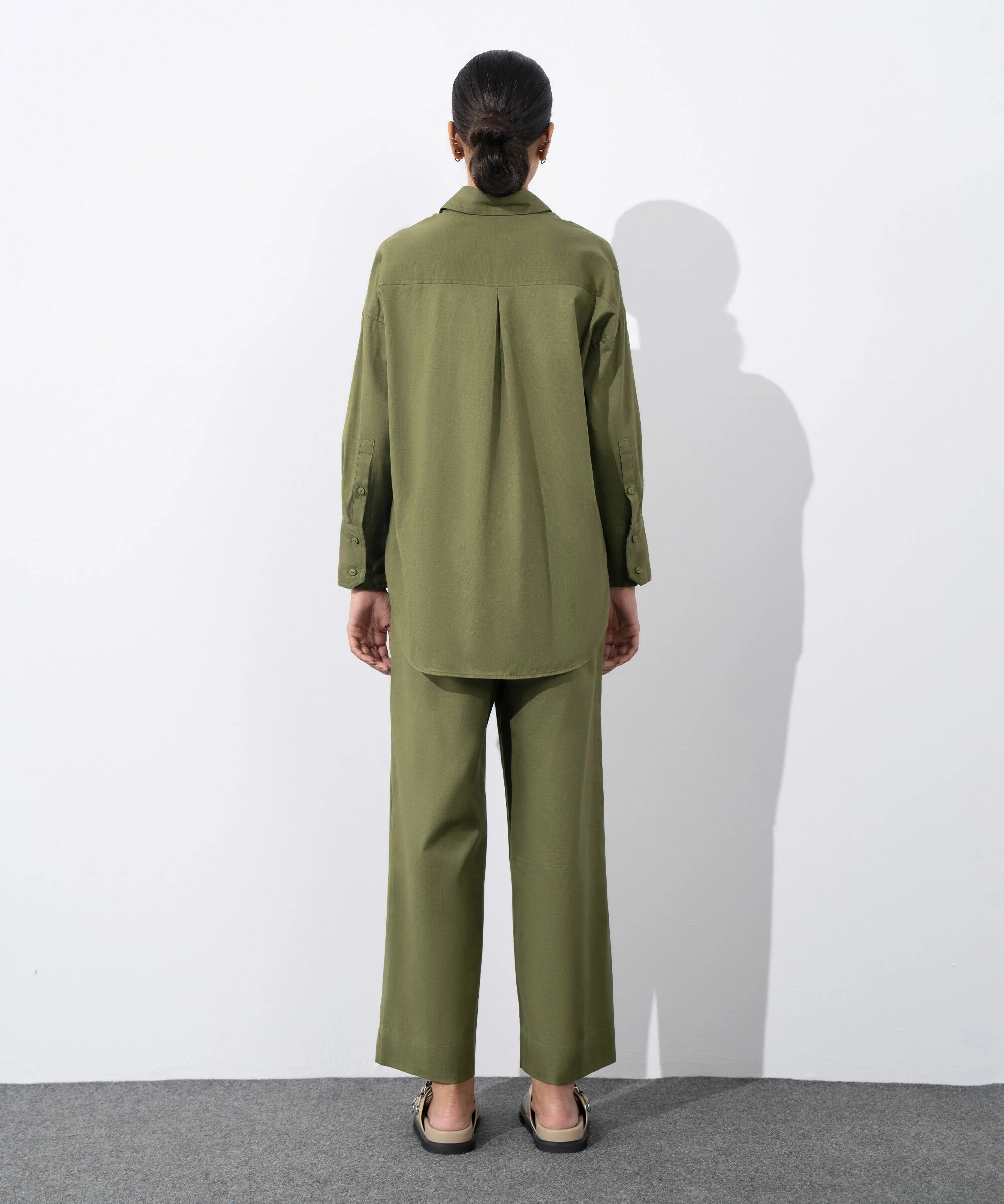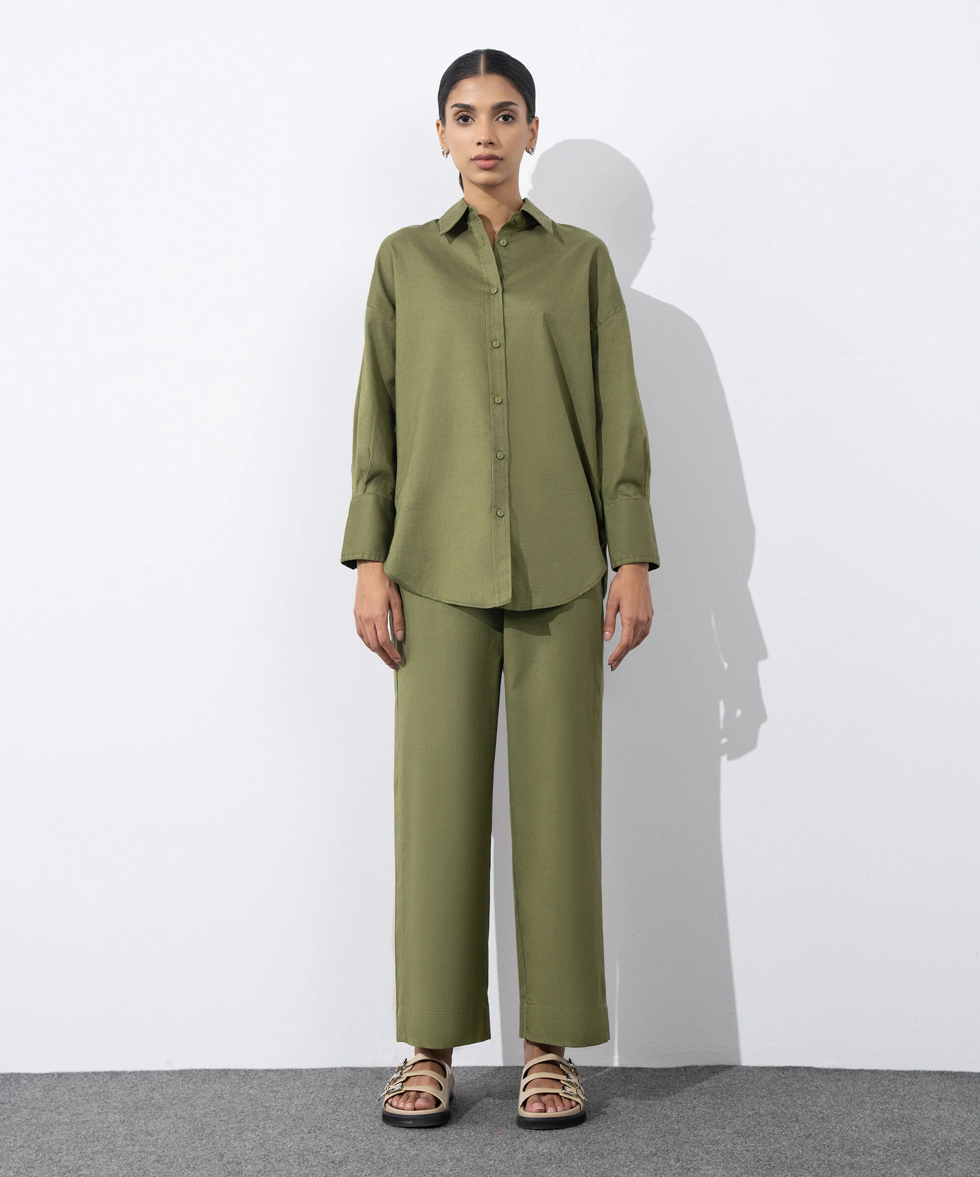 Stay stylish and comfortable in this two-piece olive green coord set crafted from a breathable 82% cotton, 18% linen blend. Featuring wide-leg trousers with pockets and drawcord waistband, paired with a matching top for an effortlessly chic look. Perfect for casual days, work, or evening outings.